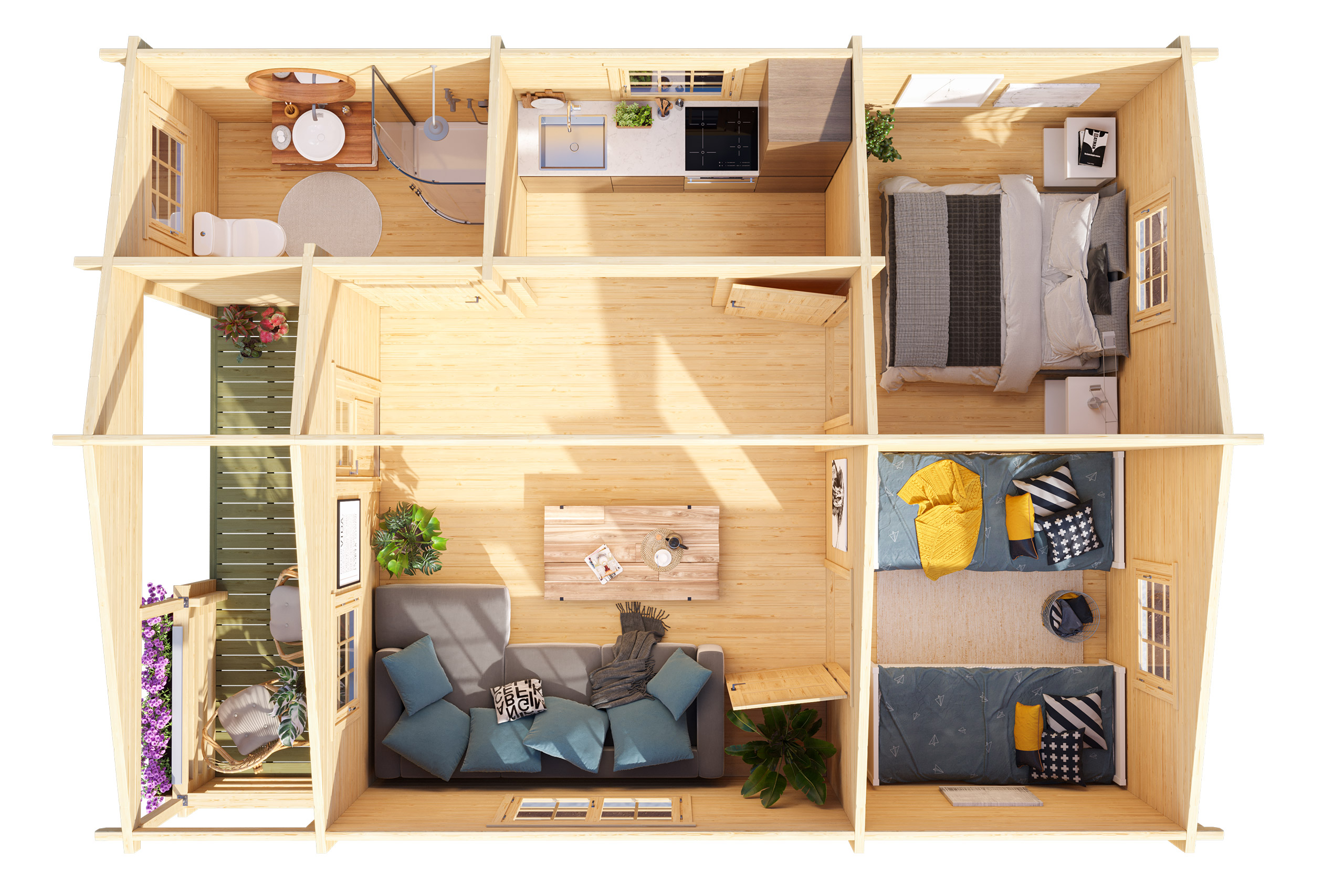 Kasai A 70 je moderna vikendica orijentirana na prostor i svjetlost. S nekoliko prozora i dvokrilnim vratima, prostor je prirodno osvijetljen i prozračan. Veličina od 36,1 m² omogućuje fleksibilno korištenje – kao radni kutak, sobu za goste ili društvenu zonu u vrtu. Izrađena od nordijske smreke debljine 70 mm, s izdržljivom konstrukcijom i kvalitetnom izvedbom. Savršen je odabir za uživanje u vikendima, okupljanja i opušteni boravak u zelenilu.